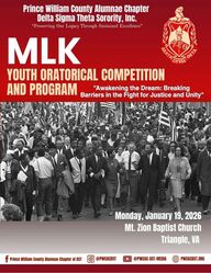“Perserving Our Legacy Through Sustained Excellence” The Prince William County Alumnae Chapter of Delta Sigma Theta Sorority, Inc. (PWCAC-DST, Inc.) is proud to serve as the annual sponsor of the Martin Luther King, Jr. (MLK) Program and Youth Oratorical Competition in Prince William County. This signature event has been held each year on the MLK Holiday, except for 2025 and in 2020-2023 it was presented virtually. Since its inception, the program has reected the chapter’s enduring commitment to educating the community about Dr. King’s legacy of nonviolence, equality, and service.The rst MLK Celebration was held in 1985, coinciding with the chapter’s chartering in December 1984. The inaugural program took place at First Baptist Church of Manassas before a capacity audience. Due to growing attendance, the event moved the following year to First Mount Zion Baptist Church in Dumfries, and later to area high school auditoriums to accommodate increasing community participation.The rst MLK speaker was Colonel Joseph Bagnerise, Sr., who remained a central gure in the program by opening each celebration with Dr. King’s “Drum Major” speech until his passing in 2005. Other distinguished speakers in the early years included Dorothy Height, President of the National Council of Negro Women; Dorothy Gilliam, columnist for The Washington Post; and Gwyne Washington, Assistant Director of Education for the D.C. Department of Corrections.In 1990, the chapter transitioned to the youth oratorical competition format that continues today. The rst youth oratorical program was held at Gar-Field Senior High School in Dale City, lling the 1,000-seat auditorium to capacity. In 1992, the program moved to Hylton High School in Woodbridge, and in 1996, the chapter partnered with Hylton Chapel in Woodbridge to meet the needs of the growing audience, which has exceeded 2,500 attendees in some years.The competition is open to middle and high school students in Prince William County, Manassas City, and Manassas Park. While only six students are selected as speakers (three middle school and three high school), many more participate annually at the school level. Over time, the program has evolved from recitations of Dr. King’s speeches to original student-written speeches aligned with an annual theme. Since 1993, the chapter has provided an original theme each year, encouragingcreativity, critical thinking, and a deeper understanding of Dr. King’s vision.In 1991, the MLK Youth Community Choir was established to enhance the program with music. Comprised of students in grades K–12, the choir reects the rich cultural diversity of the community. The inaugural choir included 87 students, with participation exceeding 200 in some years.Selected speakers receive monetary awards, and all participants are presented with the chapter’s Delta-King medallion, appropriately named the “Drum Major” Medal. The success and impact of the program have earned national recognition from Delta Sigma Theta Sorority, Inc. as an exemplary social action project. The program has also received commendations from the Prince William County School Board, Manassas City School Board, Prince William Board of County Supervisors, the Prince William County NAACP and the Town Council of Dumfries. In addition, participants have beeninvited to speak at venues including The White House, the U.S. Department of Justice, events hosted by Governor George Allen of Virginia, Disney World, and more.THE HISTORY“Perserving Our Legacy Through Sustained Excellence”