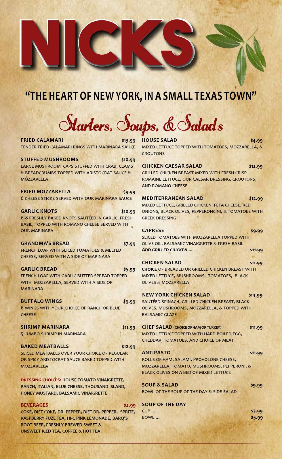 Nick's Italian Menu