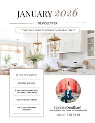 Message NEW YEAR, NEW LOOK5 QUICK WEEKEND PROJECTSTHAT BOOST HOME VALUEJANUARY MARKET UPDATELOCAL SMALL BUSINESSHIGHLIGHTYOUR QUICK GUIDE TO PIEDMONT AREA REAL ESTATENEWSLETTERfollow onCandice Southard Your Guide to Real Estate & Community LifeIN THIS NEWSLETTER:JANUARY2026